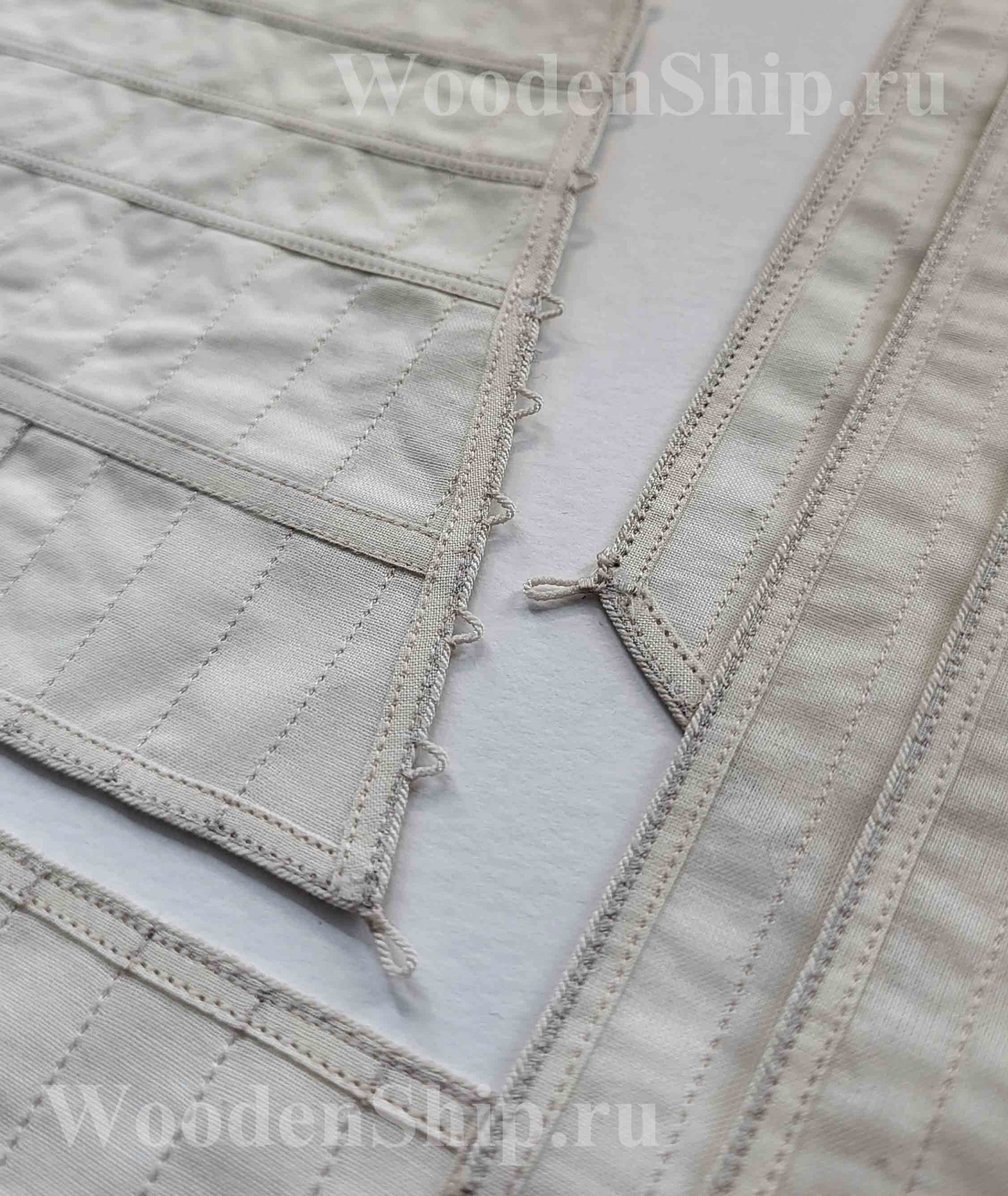 Особенности комплекта: кренгельсы более правильной формы, обвязаны у основания. Боуты подшиты под средний бант на передней (изнаночной) стороне. Стоплаты (нашивка под марс) на марселях подшиты на задней (лицевой) стороне парусов. Все риф-банты подшиты под боковые подвороты на передней (изнаночной) стороне парусов.
