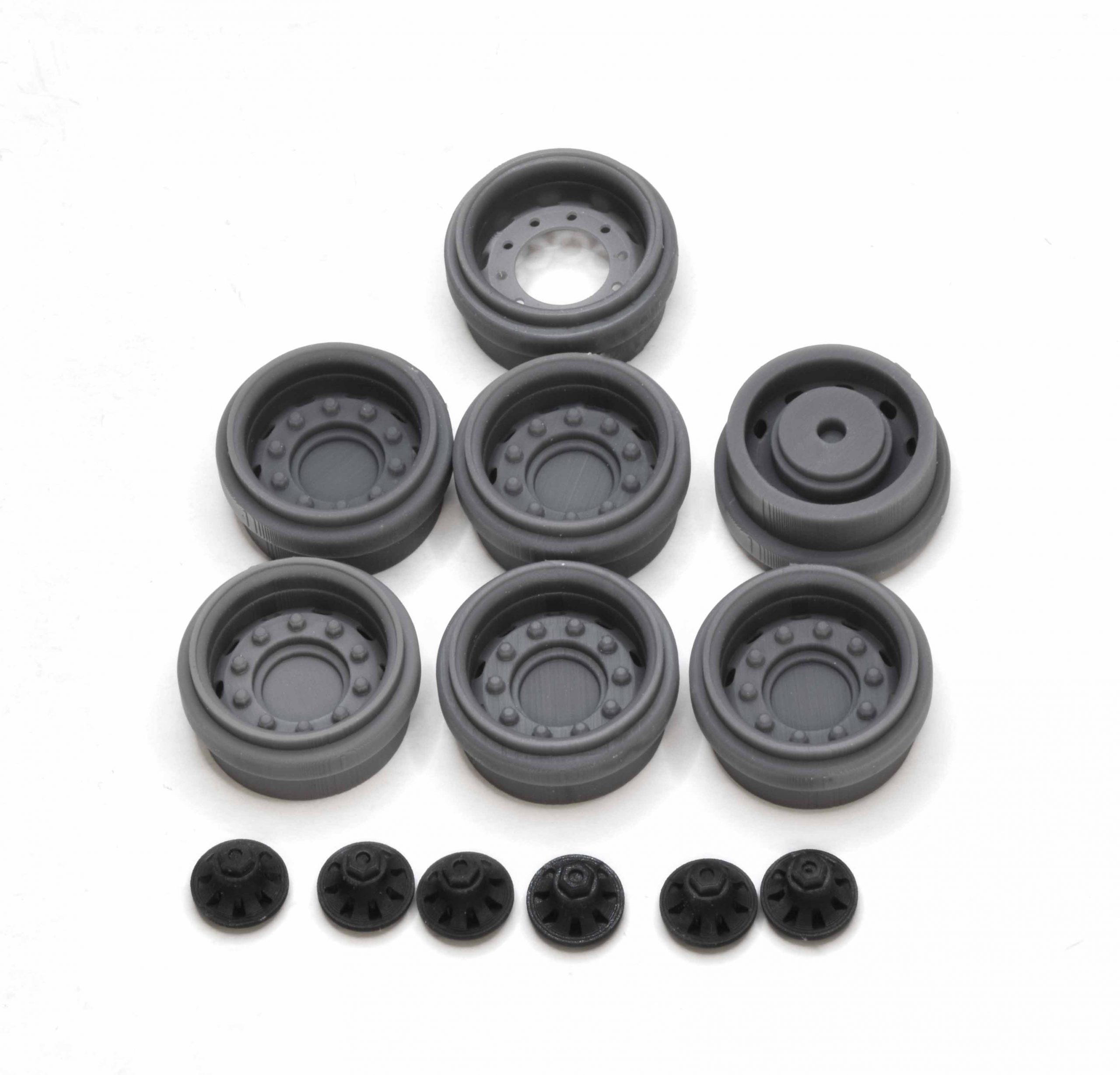 Набор колесных дисков со ступицами + диск запасного колеса, для сборной модели полуприцепа под барабанные тормоза.