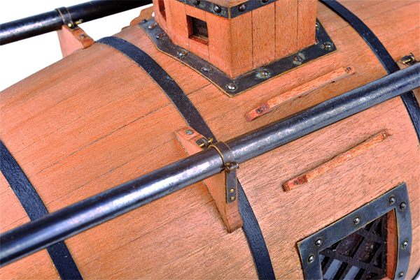 Вероятнее всего деревянное судно имело бочкообразные обводы корпуса длиною примерно 6 метров, было скреплено железными обручами, имело рубку с иллюминаторами.