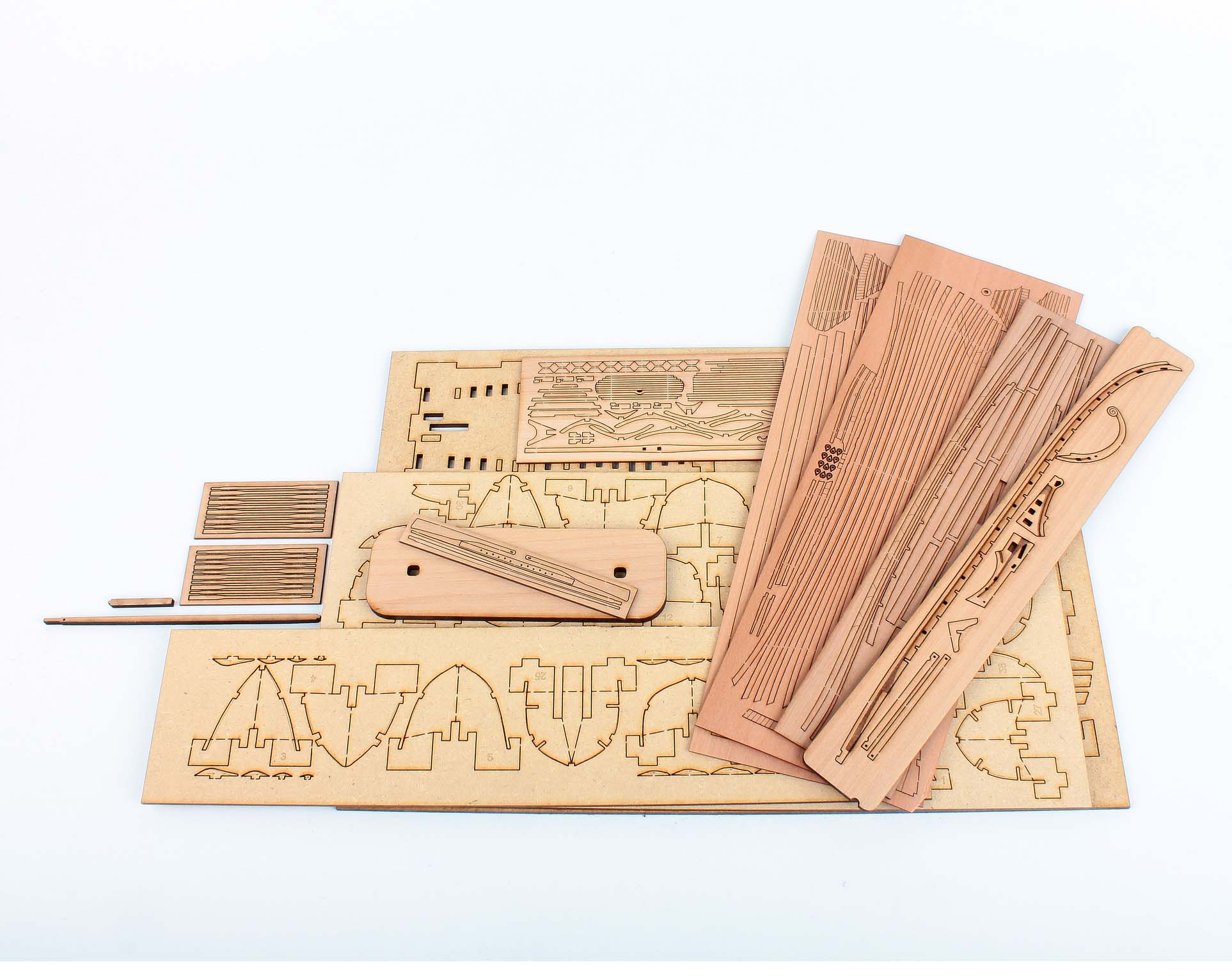Эксклюзивная комплектация из шпона груши, продуманный стапель из ХДФ обеспечивает удобство сборки. Флоры вырезаны сразу необходимой формы, а шпангоуты изгибаются из полосок, что позволяет соблюсти направление волокон древесины, выдержать масштабность и делает корпус менее ломким. 3D гравировка шпунта киля с двух сторон и разбивка его на элементы.
