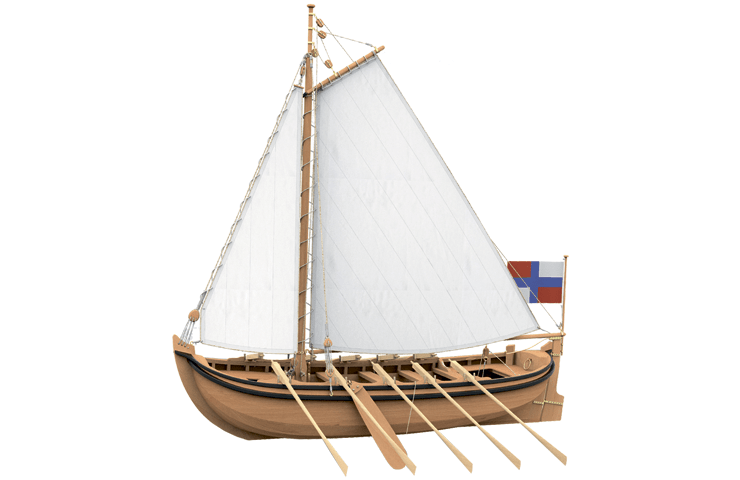 Судно имеет полные, почти круглые сверху обводы носа и кормы на голландский манер того времени. Ботик рассчитан на пять пар вёсел. В средней части носовой банки установлена мачта. В качестве парусного вооружения использован гафельный грот и кливер.
