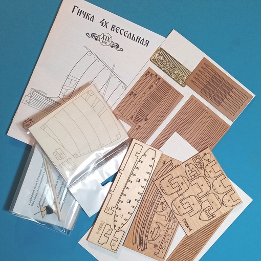 Материалы: шпон груша, фототравление, фанера, переклейка, выкройки паруса на ткани, заготовки рангоута.