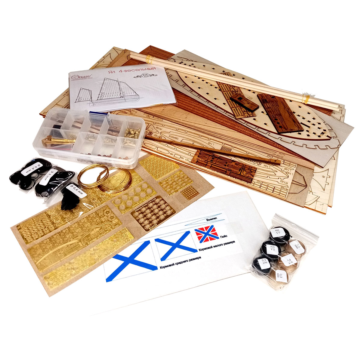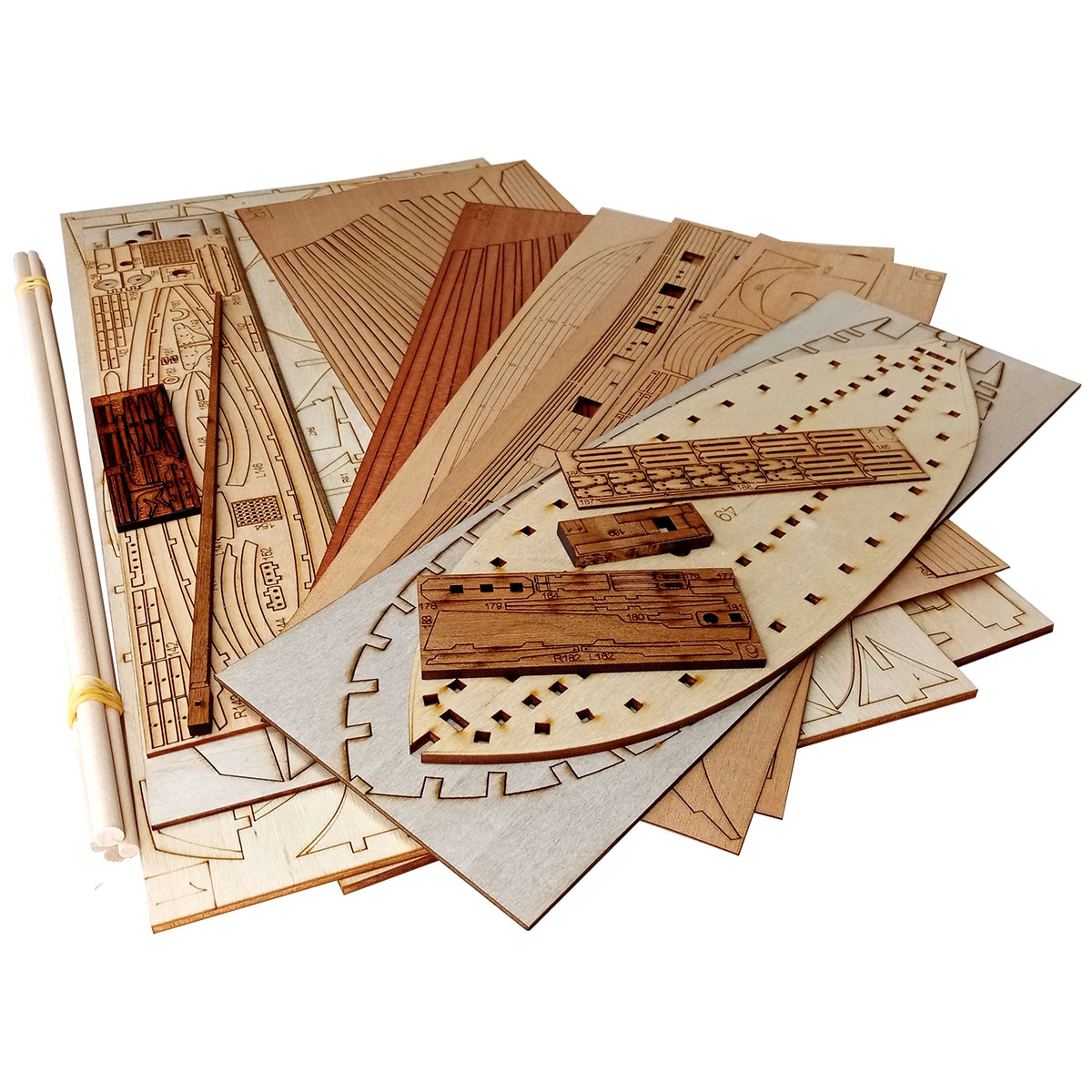 фанера, шпон, древесный массив-ламель, латунное литьё (карронады, барабан брашпиля, якоря и пр.), точёные деревянные элементы, заготовки мачт, ткань для парусов (перкаль).