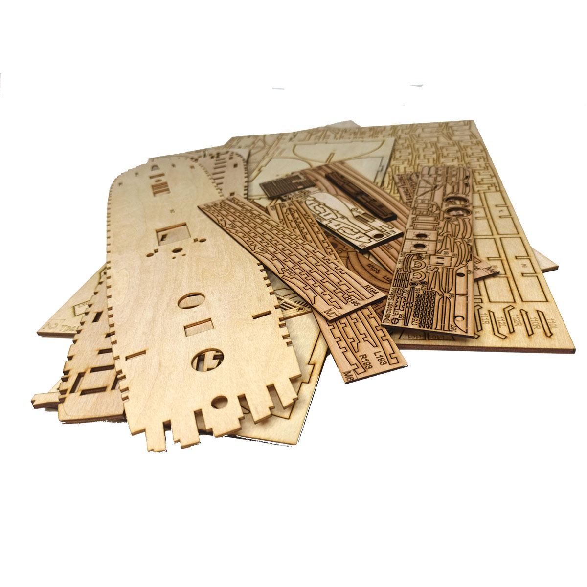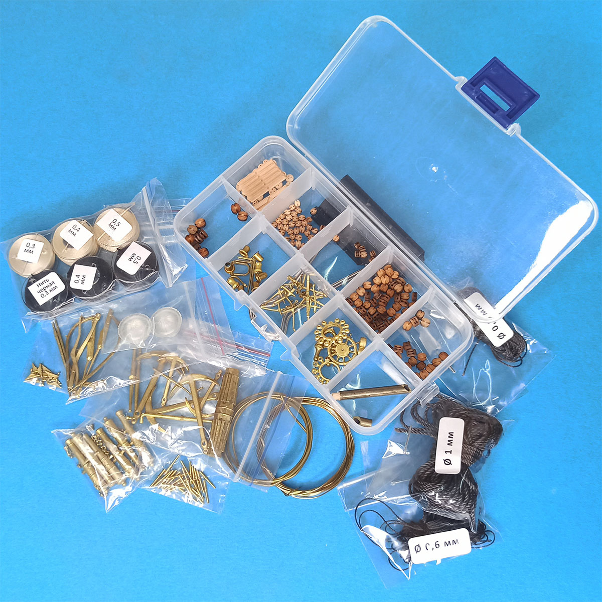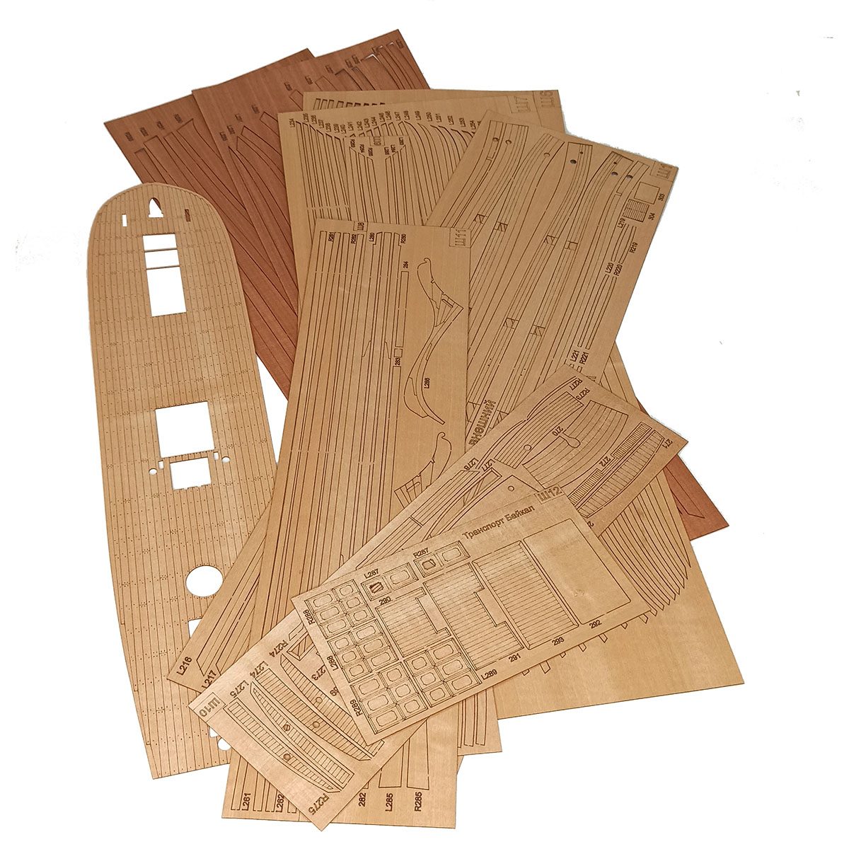 Фанера, шпон, древесный массив-ламель, латунное литьё (пушки, штурвал, анкера, якоря, брашпиль, шлюпбалки, помпа и пр.), точёные деревянные элементы (юферсы, блоки), заготовки мачт, ткань для парусов (перкаль), фототравленные элементы, табличка и декор.