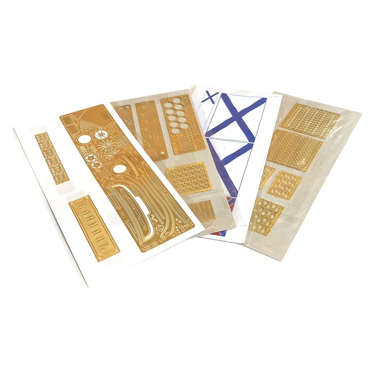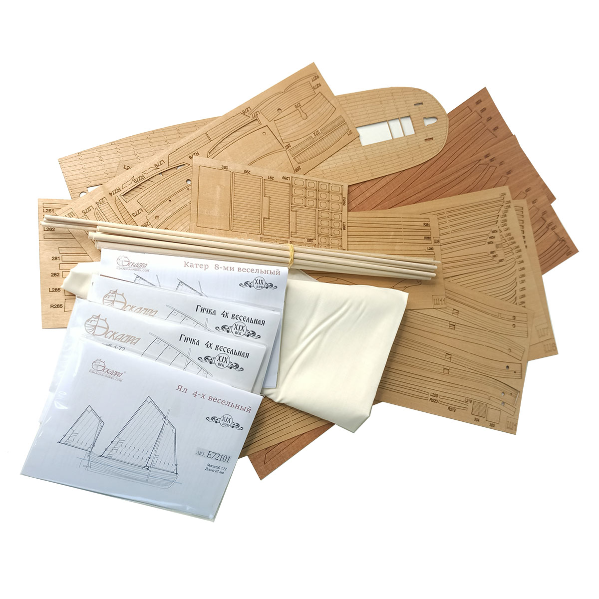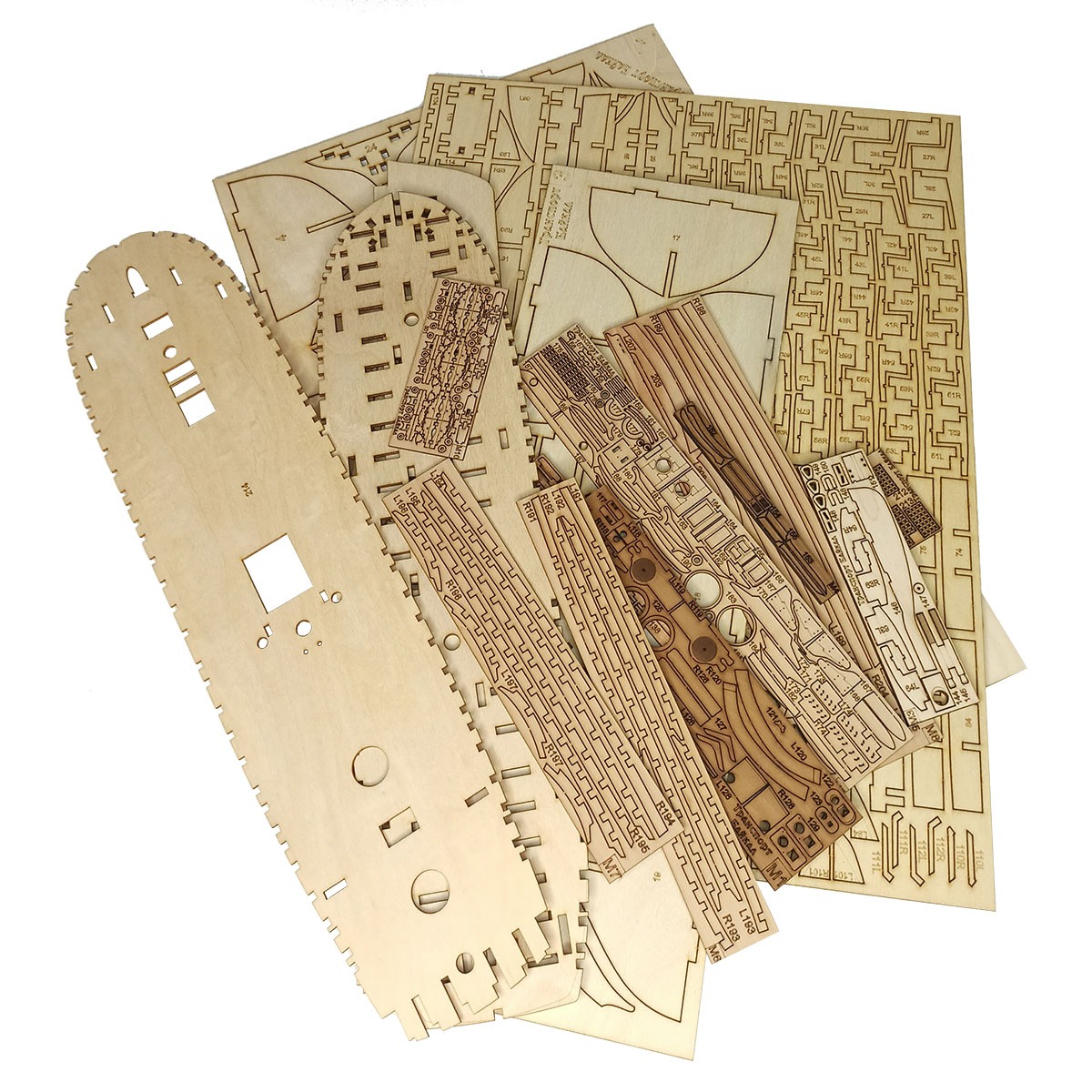 Фанера, шпон, древесный массив-ламель, латунное литьё (пушки, штурвал, анкера, якоря, брашпиль, шлюпбалки, помпа и пр.), точёные деревянные элементы (юферсы, блоки), заготовки мачт, ткань для парусов (перкаль), фототравленные элементы, табличка и декор.