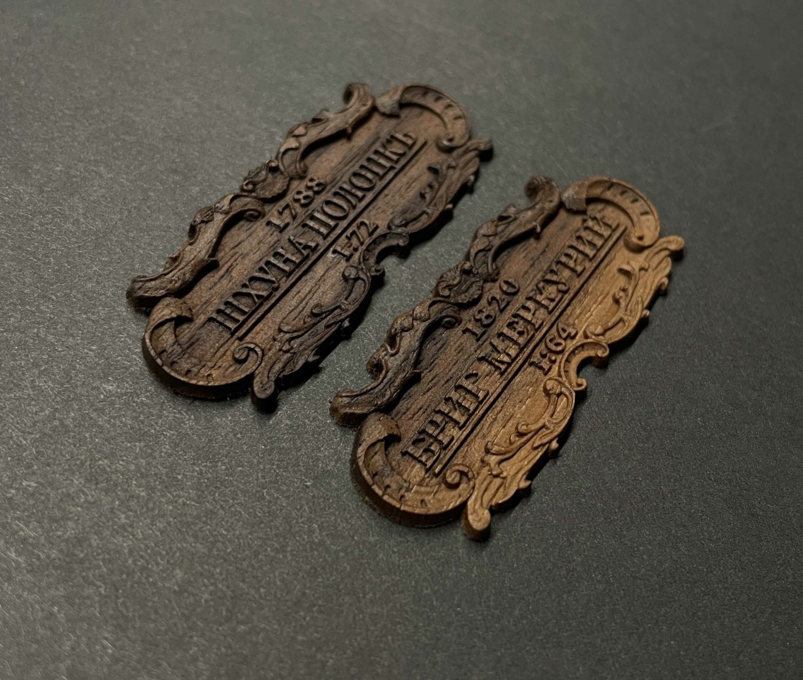 Табличка с названием модели изготовлена из массива Ореха американского. Доступна под заказ с любым текстом.